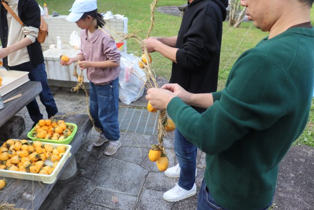 いつもの黒豆のおにぎりと豚汁をみんなで作りました。今年は藁でヒモを作って吊るし柿の体験をしました。楽しく 勉強しました