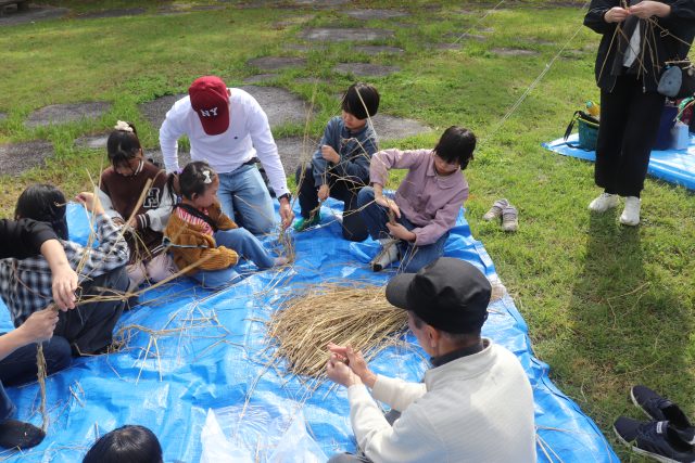 いつもの黒豆のおにぎりと豚汁をみんなで作りました。今年は藁でヒモを作って吊るし柿の体験をしました。楽しく 勉強しました
