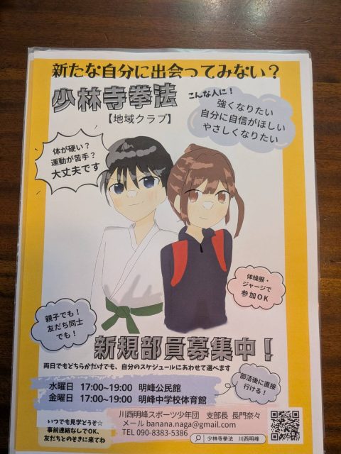 少子化や子どもの部活へのニーズの多様化、顧問をする教員の減少、教員の働き方見直しで始まった市立中学校部活動の社会移行。川西市では学校での部活動が廃止になっても、子どもたちが生き生きと学べるように対策をしています。その一つが「地域クラブ」で、地域で活動する文化・スポーツ団体がクラブ活動として受け入れをしています。今までの部活動になかった種目もありますので、市のホームページで検索してみてください。そして「少林寺拳法 川西明峰スポーツ少年団」も登録しています。いつでも気軽にお問い合わせください。下のチラシは、中学生拳士が作成してくれたものです。中学生目線で作られていて、「行ってみようかな」という気持ちにさせてくれる良いチラシができました。修練場所でもある中学校にチラシを配布し、まだ中学生の見学はありませんが、「お姉ちゃんが学校からもらってきました」とチラシをもってきてくれた保護者の方が、小学生のお子さまを連れてきてくださいました。このようにじわじわと広がっていけば、嬉しいなあと思っています。